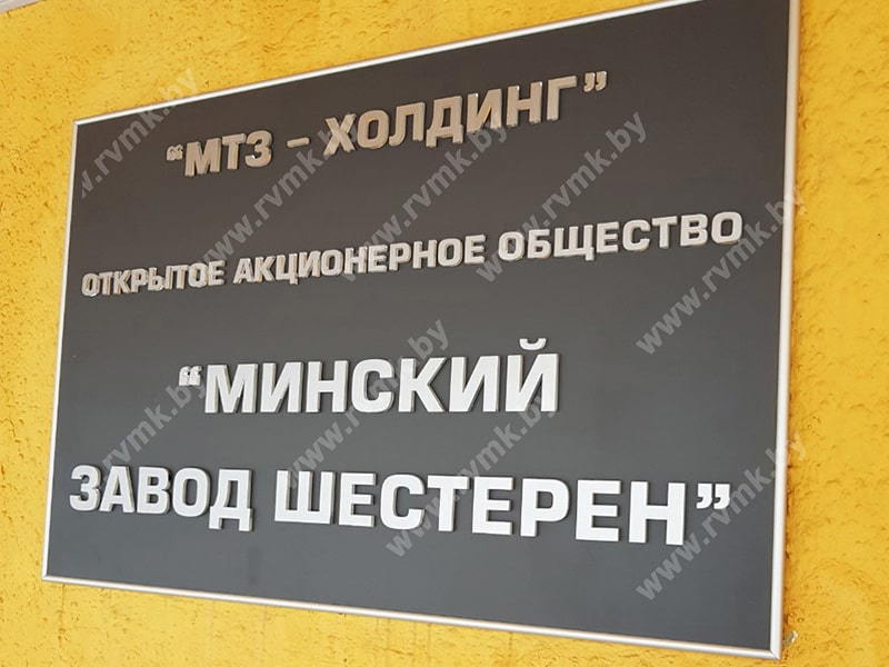 Шильда фасадная изготовлена для ОАО «Минский завод шестерен» по адресу г. Минск ул. Долгобродская, 17
